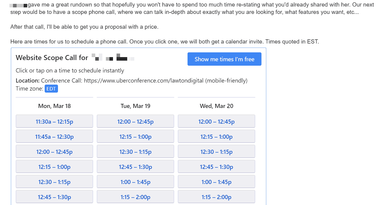 In your outreach email, include specific dates and times. Give them at least 3 options on at least 2 different days and no more than 5 total options (avoid decision paralysis, it’s a thing). Convert time options to the CLIENT’s time zone. This isn’t about you, it’s about the client, remember? Make sure to mention the time zone you quoted in. The easier you make it for them, the faster and easier it will be to schedule.