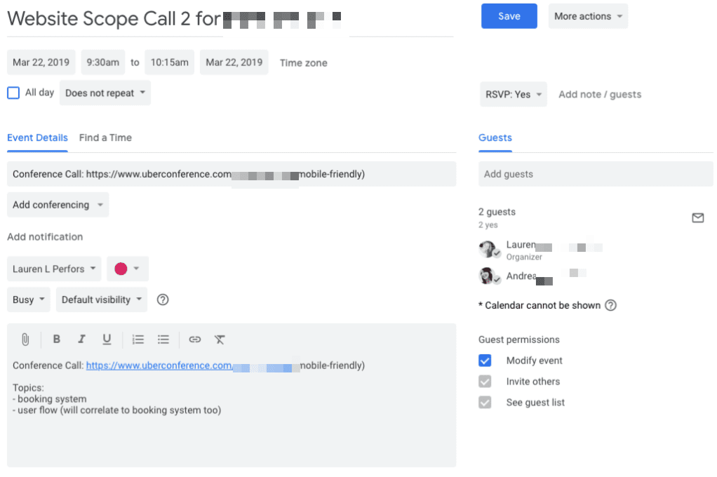 - It can also be helpful, especially with clients who have trouble staying on task (or if you have trouble) to put a summary of the call’s topics or the purpose of the call in the calendar invite description. Not necessary, but helpful!